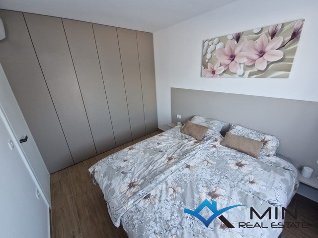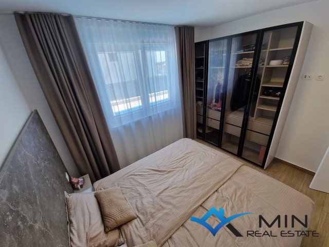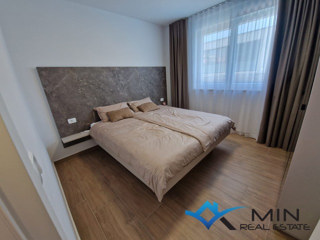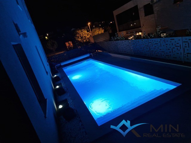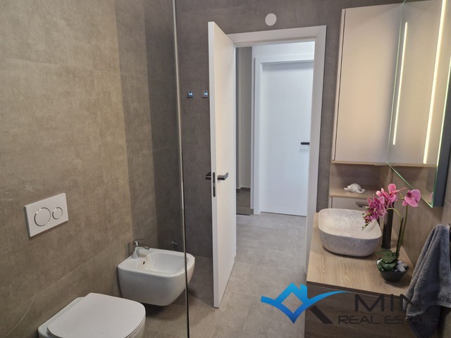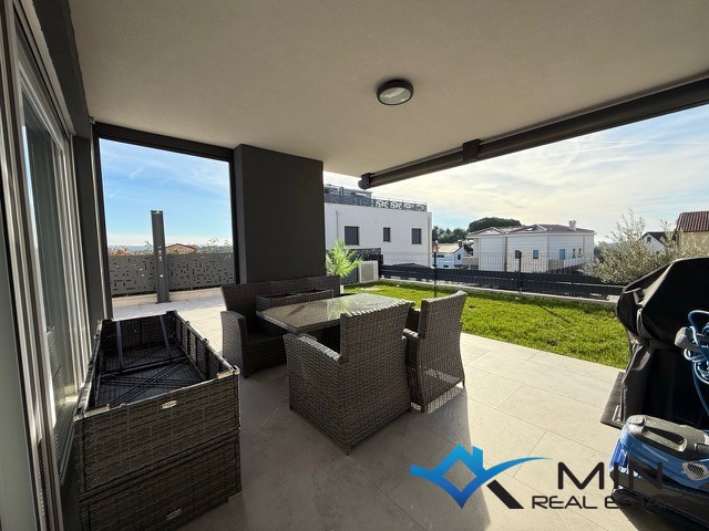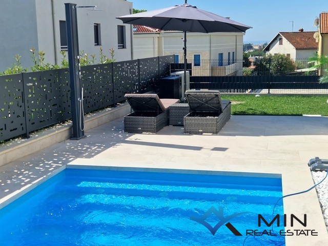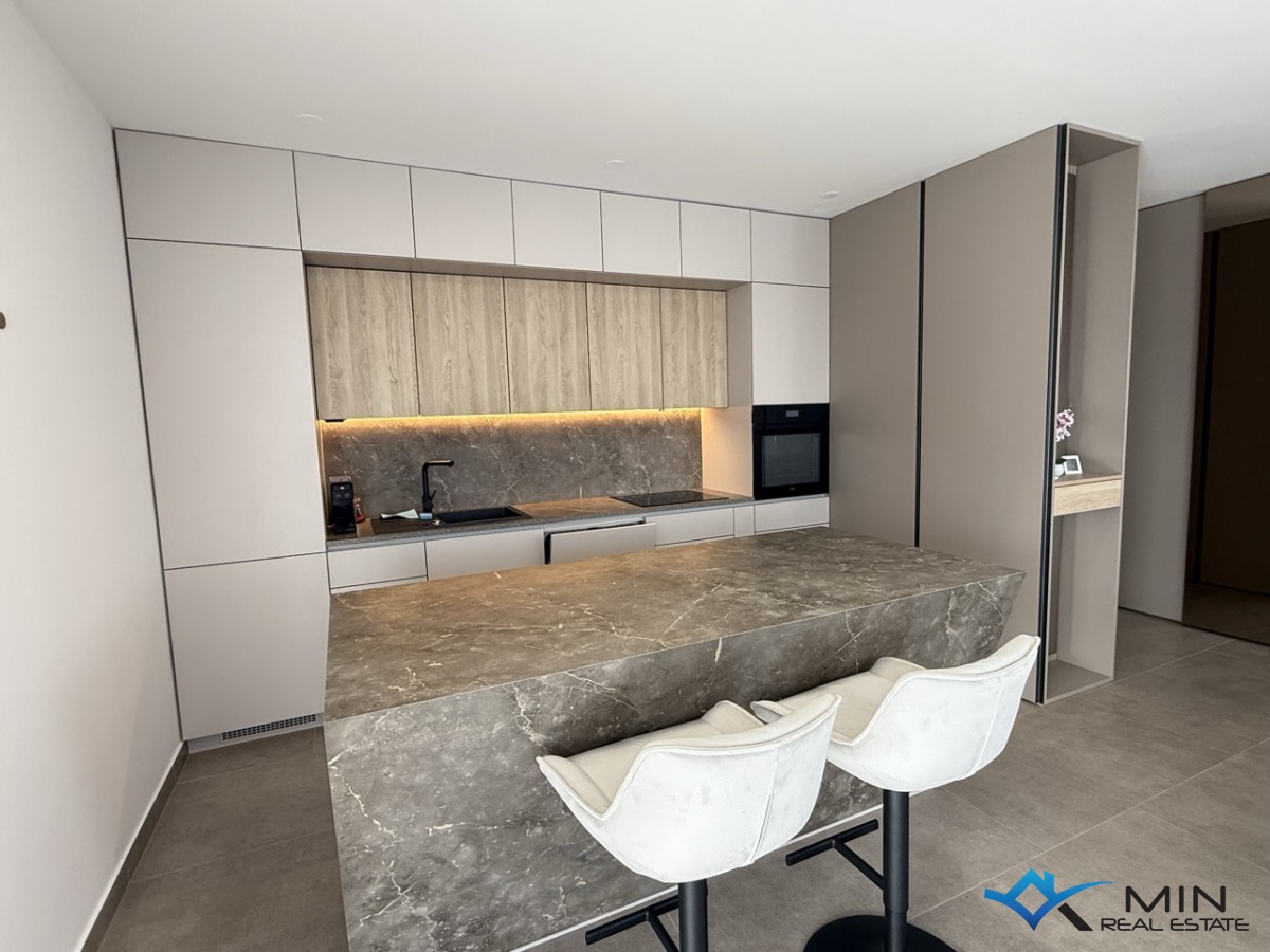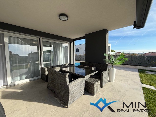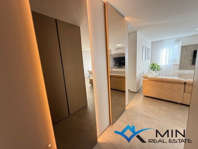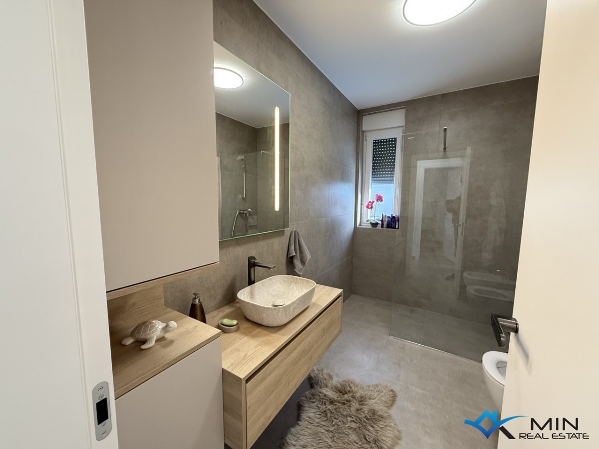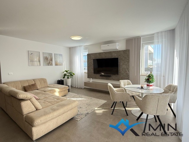Prodaje se luksuzno uređeni stan površine 89 m2 smješten u prizemlju kvalitetne stambene zgrade. Stan je kompletno opremljen namještajem rađenim po mjeri s fokusom na funkcionalnost, estetiku i visokokvalitetne materijale. Stan se nalazi u mirnom dijelu Novigrada, a iz prizemlja nudi lijep pogled na more, što ga čini rijetko dostupno nekretninom na tržištu. Stan se sastoji od hodnika, kupatila, 2 spavaće sobe i open space prostor u kojem su smješteni kuhinja s blagovaonicom i dnevni boravak s izlazom na natkrivenu terasu, lijepo uređeni vrt od 134 m2 i grijani bazen od 27 m2 sa slanom vodom. Stan ima spremište u podrumu zgrade od 6 m2 do kojeg je moguće doći i liftom. Stanu pripadaju 2 parkirna mjesta koja su opremljena punjačem za električna vozila.