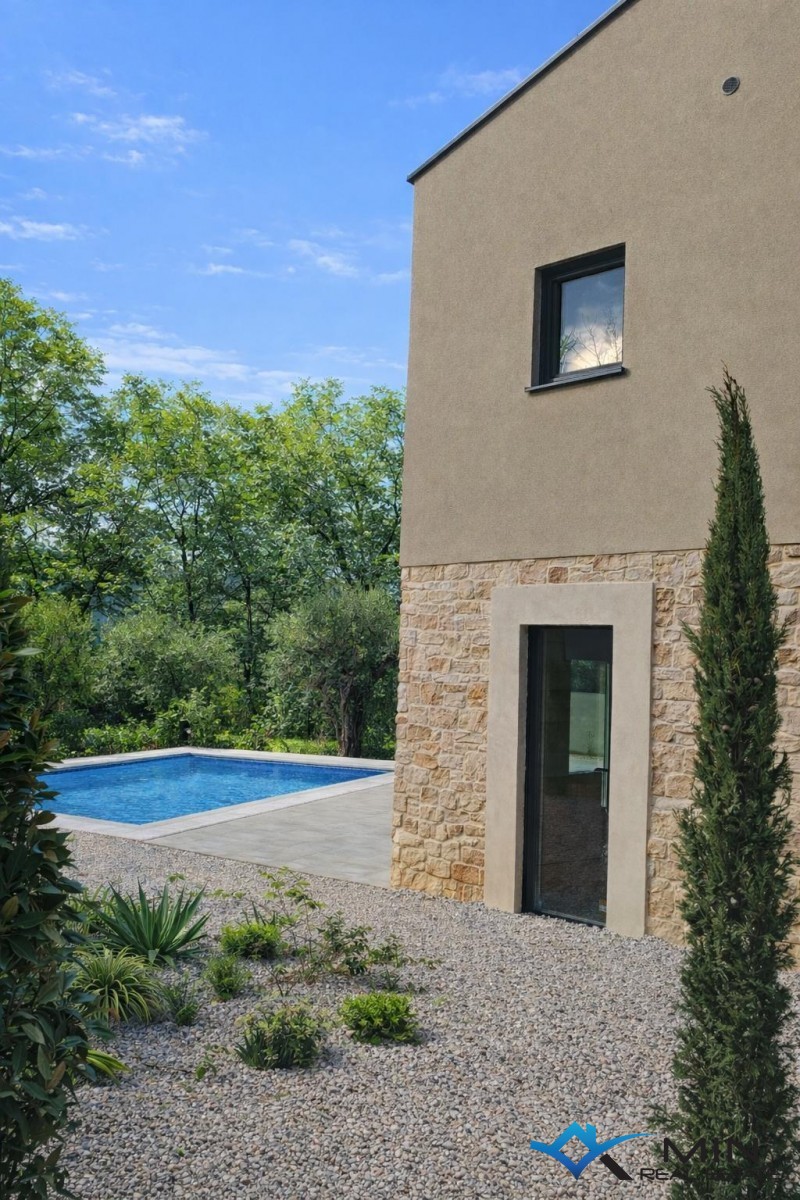 Prodaje se šarmantna dvojna kuća s pogledom na more te se nalazi na mirnoj lokaciji u okolici Novigrada. Kuća ima 120 m2 i proteže se na 2 etaže, a sastoji se od prizemlja i 1. kata. U prizemlju se sastoji od hodnika, wc-a te open space prostora u kojem su smješteni kuhinja s blagovaonicom i dnevni boravak s izlazom na okućnicu. Okućnica ima 505 m2, lijepo je uređena, a na njoj se nalazi ljetna kuhinja i bazen. Na 1.katu nalaze se 3 spavaće sobe i 2 kupatila. Grijanje i hlađenje u kući je putem 4 klima uređaja, podnog grijanja i kamina. Kuću je moguće koristiti u stambene ili turističke svrhe. Kuća se prodaje kompletno namještena i opremljena.