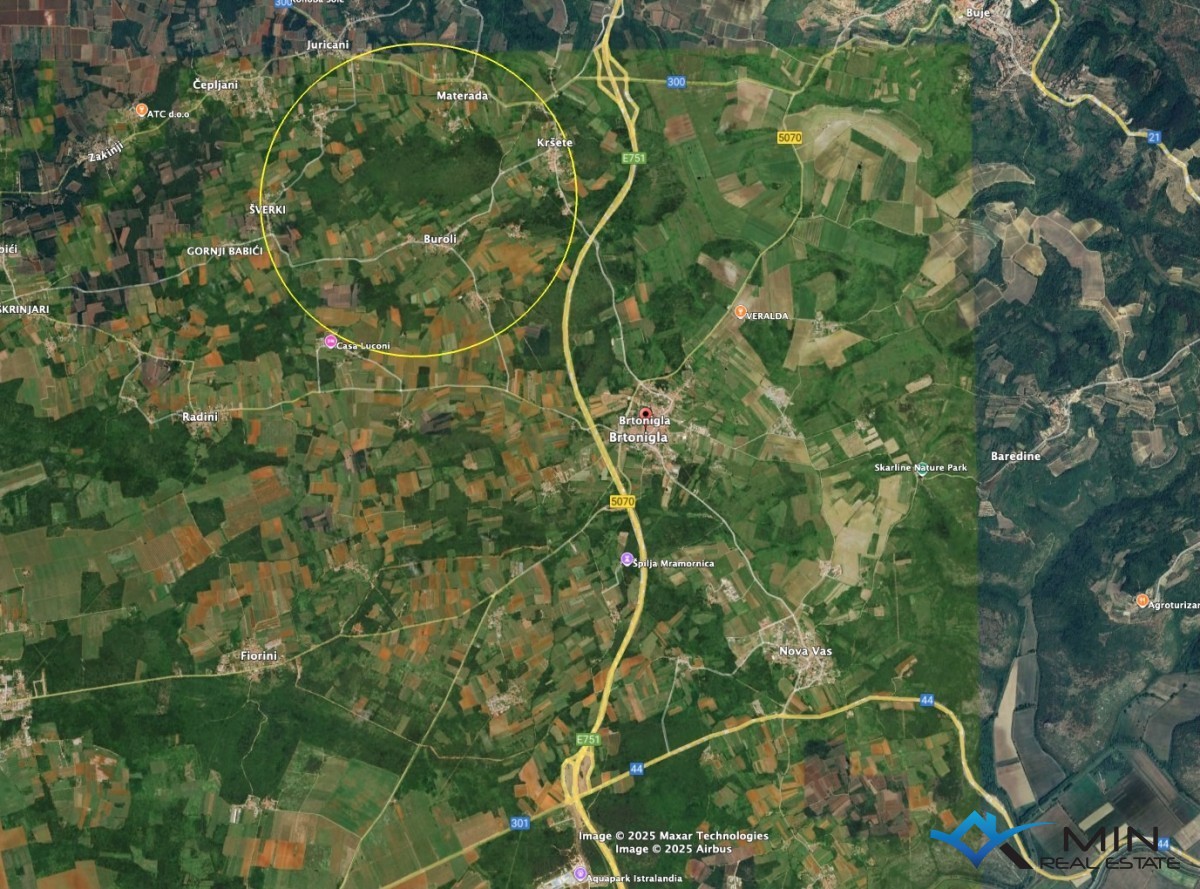 Prodaje se građevinsko zemljište na mirnoj lokaciji u okolici Brtonigle. Zemljište ima 1236 m2 te je dobivena građevinska dozvola za izgradnju vile s bazenom od 200 m2.. Prostire se na dvije nadzemne etaže, prizemlje i 1. kat. U prizemlju će se nalaziti hodnik, dnevni boravak s kuhinjom, blagovaonicom i ostavom, radna soba, WC i spremište te vanjska natkrivena terasa odakle će se dolaziti do ljetne kuhinje, WC-a i spremišta. Na katu se nalaze tri spavaće sobe s dvije kupaonice i nenatkrivenom terasom. Udaljenost od centra brtonigle je 2 km, a udaljenost od mora i lijepo uređene plaže je 7 km.